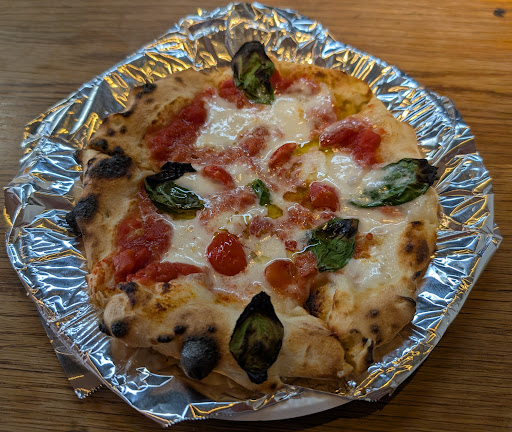 基本のマルゲリータ。トマトとチーズだけのシンプルなピッツァにバジルがあしらってあっていい香り。薪窯焼きのせいかフチがちょっとコゲてるけど、むしろこういうのがいいんだよ。じつにジューシーで旨い!生地の香ばしさ、甘み、トッピングとの一体感、これはなかなか。一人ならSサイズ(21cm)でサイドメニューと一緒に食べてちょうどいい感じかな。