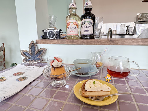 2024年7月13日、土曜日、午後4時頃、ふたりで初訪問。 外観も、内装も、とてもお洒落です。 私たちは、空いているテーブル席を自由に選んで良いと言われ、窓側のテーブルを選びました。数テーブル程でした。カウンター席も、数席程で、空間が広く感じられました。 そう感じられるのは、窓が、広いことも関係していると思います。 私たちは、メニュー表から、 プリン 470円 プリンパフェ 750円 ドリップコーヒー 550円 アイスコーヒー 500円 を注文しました。 ドリンクは、デザートメニューとセットで、それぞれ200円引きだそうです。 私が食べたプリンは、ツルツルでもなく、ボロボロでもなく、程よい弾力の硬めのプリンでした。生クリームは、甘さ控えめで、スライスされたダークチェリーが美味しかったです。 息子が食べたプリンパフェは、薄いラベンダー色のメレンゲクッキーがプリンの上と下に添えられ、プリンの上には、生クリーム、下には、バニラアイスクリーム、その下には、紅茶の葉の入ったスポンジ。かなり美味しかったと言っていました。 コーヒーは、ホットもアイスも、酸味寄りで、雑味がなく、すっきりした味わいでした。 とても、お洒落なお店で、味も良いので、若い女性客がお喋りを楽しむには、最高なお店だと思いました。カウンター席の赤ちゃん連れのママも綺麗な装いだったし、玄関ドアの前で、写真を撮っている若い女性の二人連れもいました。 駐車場は、お店の前に、10数台分ありました。久しぶりに、女友だちと待ち合わせて、こんなお店で、お喋りを楽しみたくなるよう...
