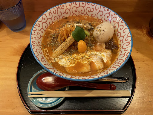 出来上がった香辛伽哩麺(味玉)、スパイス感が最高でした! 麺はやや幅広の平打ち麺、鶏チャーシューに様々なスパイスの複雑に絡み合う香り… 具もひき肉、玉ねぎ?のアチャール的なものや、枝豆、ヤングコーン(味付けがすごく美味しかった!)などたくさん入っていました。 お腹に余裕があったら、追い飯してスープを残さず堪能したかった… スパイスのおかげで、汗をかくほど体が温まりました。