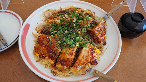 『お好み焼き』のイメージが強く、注文したことがない『とんかつ』を注文しましたが、温かいデミグラス風ソースがかかって提供されました。付け合わせは千切りキャベツとポテトサラダです。 サクサクのとんかつを期待して注文すると残念な結果になりそうですが、個人的には好きなお味と食感です。