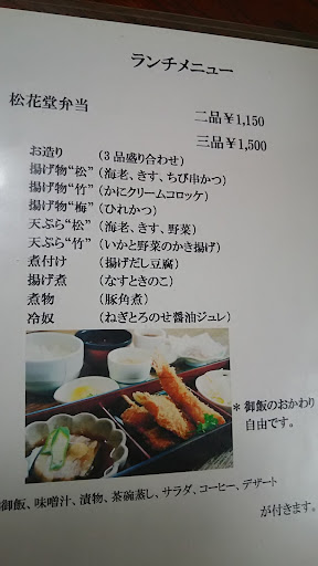 数種類のランチメニューあり。 奮発して3品も選べる松花堂弁当。 いろいろ食べてみたくて。。 ①キス、海老、かぼちゃ、なすの天ぷら。 ②お造り(3品盛合せ)4品あったけどね。 ③奴(ねぎとろ醤油ジュレのせ) ご飯、味噌汁、ミニ茶碗蒸し、ミニサラダ、お漬物。。。さらに食後のデザートにコーヒーまで付いて税込1650円。