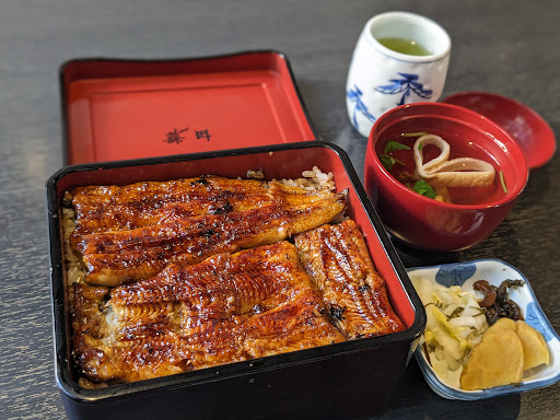 うな重(山): うな重の種類は全部で5種類(川・花・山・特山・二段)!! それぞれ鰻の量が変わってくるのでお腹と相談して決めてくださいね!! また、各種きも吸・お新香が付いてきます!! 今回は真ん中の「山」を注文しました!! ふっくらとしているけれども身は締まった鰻が美味しい😆 脂の乗りがよく、秘伝のタレがより鰻の旨味を引き立たせてくれます!!