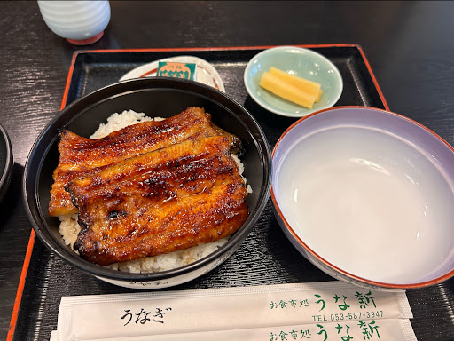 浜北方面を目指していて見つけたこのお店。GoogleMapの評価も高かったので寄ってみました。 11時30分頃の入店でしたが、既に数組のお客さんがいました。繁盛しているようですが、客層は地元の家族連れの、ちょっと贅沢なランチといった感じですかね。お年寄りも多かったです。 鰻丼セットを注文しました。4,500円弱だったと思います。鰻のお店ですから、提供まではまあまあ時間が掛かります。 セット内容は、大きな鰻が一尾載った丼と、肝吸い(美味しい!)、メロンに抹茶羊羹。静岡県だけあって、緑茶も美味しかった。 鰻は関東風なのでしょうが、身がしっかりしていて、見事な焼き上がりでした。当たり前ですが妙な生臭さが無く、良い香りがします。ゆっくり味わって戴きました。とても美味しかったです。地元の方が多く来る店には、やっぱり外れが無いですね。 壁に飾られた絵画は、昔のうな新さんの風景のようです。良い雰囲気のお店で、お客の扱いも親切、丁寧でした。アルバイト(?)の若い女性店員さんが、元...