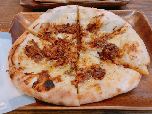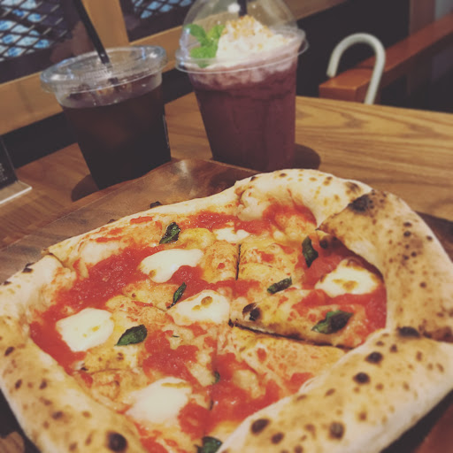 Modern cafe with plants & bare brick, serving pizza, & coffees made with beans roasted inhouse.