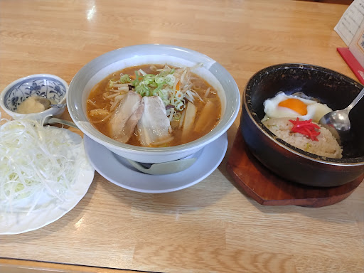 2025/07/12 11:50頃到着。駐車場は1台分空いていた。店内入るとテーブル席に案内された。カウンター席はいっぱいなんだろうか?1人でテーブル席を使うの案内されたとはいえ快適だが何だか申し訳ない気持ちになる。口頭で注文するスタイル。味噌らーめんトッピングでおろしにんにくとネギ盛とチャーシューそれとミニ石焼炒飯…更にテイクアウトで若鶏の唐揚となんこつ唐揚を注文。少し時間がかかったけど石焼炒飯の影響かな?着丼のとき石焼炒飯はパチパチと音を立てている。まずは味噌らーめん。スープはあっさり目で麺は中細であっさり目のスープに合う。ネギ盛は白髪ネギで別皿にいっぱいある。ラーメンに投入して食べる。おろしにんにくで少し味変して食べる。石焼炒飯は軽くまぜて食べる。お焦げが出来ていてずっとアツアツのまま食べれるのが良...