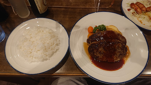 Read more夜の時間に行きました。 前回はラストオーダー間近ということで断念。 現在短縮営業8時閉店とのこと。 お水はセルフで。 デミソースの煮込みハンバーグ、ダブルいただきました。 (名前忘れた…) サイドのサラダ200円を添えて。 デザート行ける余裕があるくらいの満たし具合なのでデートで食べてもダイジョーブー♪(個人の感想です) デザートにパフェ食べてぇ~って思いながら帰ってきた。 余談、部屋に転がってた前日購入セブンのダブルクリームシューをいただいたよ。満足満足。