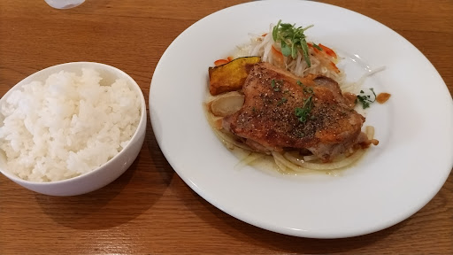 お肉のランチ 若鶏の黒コショウ焼ガーリックオイル 1,600円を食べました。 以前から気になっていたお店でしたが、とても美味しかった❗ 調理が素晴らしい❗ ニンニクだけの香りか❓鶏肉の脂とまざってか、とてもいい香り❗ 塩加減も絶妙で、尖った塩味はまったくなく、塩麹のように甘みを感じて旨味がある。 焼き方も憎く、皮はパリパリで香ばしい❗ こんな美味しいチキンソテーは何年ぶりか❗ 食べ終わってもしばらくは、香りと旨味で口の中は満たされていた❗ ただ、ライスは茶碗、おっちゃんだからか、接客はいただけなかった。