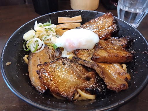 歳も押し迫った12/30。 息子と二人で半田に用事があり、ランチスポットをサーチ。 すると、「麺屋さくら」というラーメンの名店を発見。 二人でウキウキ向かい、到着すると、その日は会員予約限定のイベントデー。 完全にラーメンの腹になっている状態なので、近辺でラーメン屋さんを探して、偶然見つけたのがこの「まるぼうず」でした。 googleマップの口コミ評価もまずまずなので「ここにしよう」と心を決めていざ入店。 店内はカウンターとテーブルとで20席くらいかな。 年末にも関わらず、結構繁盛している様子。これなら安心。 券売機で選んだのは「混ぜそば肉マシマシ」と、息子は「つけ麺肉マシマシ」。あと、ランチ250円サービスの「チャーシュー丼」。ちなみに、ランチタイムのランチ無料サービスは今はやっていないみたい。 注文して、カウンターに着座。 店員は一人で、坊主頭の、多分店長さんが一人で切り盛りしている様子。 数分待って着丼。 混ぜそばの肉は本当にマシマシ。麺が見えない。。 つけ麺にもたくさんのチャーシュー。 そしてもちろん、チャーシュー丼にも。 これ、肉頼みすぎたな。。。 食べてみると、くどそうで意外とあっさり。 チャーシューがまたうまい。 炭火で焼き上げているらしく、香ばしく味わい深い。 全体バランスも良く、ボリュームも満点。お腹いっぱい。 あえて言うなら、テーブルに酢や魚粉など味変アイテムがあるとさらにうれしいですが、充分満足。 偶然見つけたお店でしたが、また...