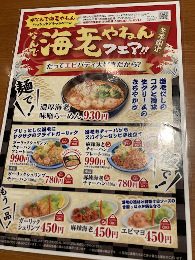 閉店間際でしたので、テーブルに案内されて、じっくりメニューチェックしようかと思っていたら、テーブル上に置かれていた限定メニュー見ると、 『なんで海老やねんフェア‼️』と『濃厚海老味噌らーめん』が目に飛び込んで来て即決(笑)