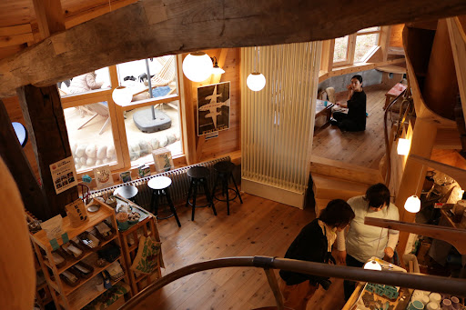 Read moreあけぼの子どもの森公園にあるカフェ。 このカフェもきちんと、この公園と同じコンセプトで作られています。 平日のお昼くらいに行ったのですが、この公園自体が人気で、当然このカフェも人気でした。 外にはテラス席があり、テラス席は割りばしを集めたような不思議なリクライニングチェア?のような椅子がいくつかありました。 中は靴を脱いで上がるようになってました。木の無垢材で作られいて、日差しも入ってくるので明るい印象があります。真っ直ぐ整然と作られているわけでなく、曲線やゆがみがあり、自然を意識した、あるいは秘密基地的な作りなのかな?と思いました。材質も木ですが、デザインがそもそも樹木的なのです。 階段を上がると、子供スペースがあったり、床に座れたりする席があるみたいでした。そこはいっぱいだったので、一階のテーブル席に。 運良くすぐ席が空いただけでもよしとしないと。椅子は普通の椅子でした。名物のオープンサンドはパンがなくなってしまったので出せないとのことで、カフェラテや季節のタルトなどを。タルトは時期の果物などがのってました。 ※タルトはしっかり系土台(アーモンドプードルなど入れて焼きこんだような台の上にフルーツがのっているタイプでした) タルトのお皿がアラビア、ムーミンです。どのお皿が来るかはお楽しみです。カフェの食器も素敵ですし、木のカウンターにはムーミンの食器が並んでいて、興奮します。この建物のここに並んでるたくさんのアラビアのムーミンが見れてよかったです。興奮します。 絶対に忙しそうですが、スタッフさんも感じよかったし、トイレも素敵でゆったりしててよいです。 しばし寛ぎタイムを過ごし、カフェを後にしました。自分が入店する前からおじさん軍団が、ずっとテラス席におりましたが、まだいらっしゃいました… 公立のこんな素敵な公園にこんな素敵なカフェがあっていいなぁと思いながら、少し歯ぎしりしました。 お役所が関わっててここまできちんと世界観、コンセプトを保ちながらの公園カフェとかないですもの(自分の回り調べ)…