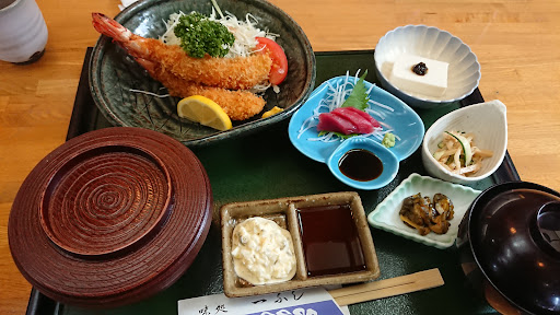 週替りメニューの大海老定食を頼む 本当に大きく衣サクサクで身もしっかりして甘い 丁寧にタルタルとソースの2種類が用意され お刺身も付いてくる(こちらは勿論醤油) これで970円! 埼玉の山近く(失礼)でこんなに美味しい海老フライが食べられるとは、 なんという僥倖