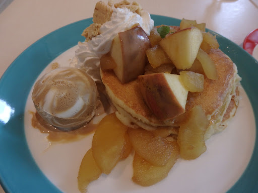 Read more平日14時前に入店。 待ち時間なく、すぐに席に通されました。 店内は混雑もなく静かでしたが、そのわりに料理の提供時間がとても遅かったです。 注文した中のパンケーキだけがなかなか届かず他の料理を食べ終えてしまったので、さすがに遅いと思いスタッフに声がけしようとした時やっと厨房からそれらしき料理が出てきたのが見えたので、運ばれてくるのを待っていました。 が、何故かその場に放置。 厨房からホールスタッフに料理が出来ている旨の声がけが何度もあり、2人のホールスタッフがその都度料理の前に立ったり、料理前を何度か通過したので間違いなく視界に入っているはずなのに素通り… その場にはパンケーキしか置いていなかったし、スタッフの動きを見ていましたが店内をゆっくり見渡しながらうろつくだけ。 もしかしたら何かしらの理由があったのかもしれませんが、ようやく届いたパンケーキは案の定冷めてるし、添えられたアイスも見た目は溶けておらず安心したのに中はどろどろ… 散々待たされモヤモヤした上に美味しくないパンケーキを食べる事になり、他店で食べれば良かったと激しく後悔。 私達の席から遠い所をうろうろしていて声がけのタイミングが悪かったとはいえ、席を立ってでも声がけしとけば良...