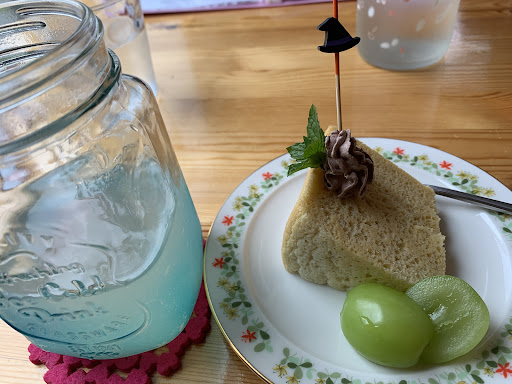 私は、栗のシフォンケーキとジュースにしました この日のジュースは洋梨で美味しかった😋 食前にシソジュースを出してもらいました