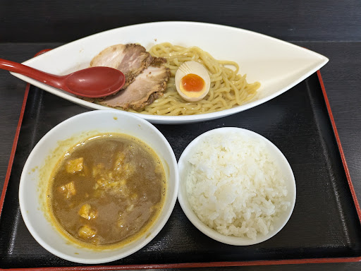 店内も 昔風のラーメン屋と言う感じでしたが 思ってるより キレイでした。 おすすめは つけ麺 または カレーつけ麺となっていましたが 初めてなので シンプルにつけ麺にしました。 つけ麺も 「つけ麺のみ」と「トッピング有り」から選べます。 トッピング有りは +100円で チャーシューと煮卵、のりが付いていました。 また この日は 土曜日のお昼だったのですが ランチとして ライス(小)が 無料で付けられると言われました。 もちろん ライスも付けてもらって 頂きました。