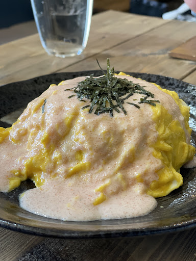 そしてメインのオムライス。 ピザメインのお店で好奇心に抗えず注文しましたが、コレも大当たり‼️ 中はキノコなどが入ったピラフ風のバターライス?でしたが、大葉が効いているようでした。 それが明太クリームのソースと合わさった時の美味しさといったら…うん、100点。