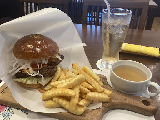あー、ハンバーガーのパティが肉肉しくてジューシー。そして玉ねぎとトマトがいい感じにさわやかに感じる。ピクルスはかなり酸味が強くて手作り感あって美味しい(^^)ポテトは少し油を吸ってて味薄め。ケチャップをもらって食べました。しかしポテトの量が多くて嬉しいですなぁ⭐︎