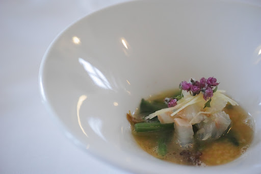 Right after we were sat, the waiter announced that we would be having a pork course, which is incorrect given how we reserved the fish one. So we had to explain it to the waiter all over again. A small nuisance but a nuisance still. We had an olive oil and salt on plate prepared for us, but we had to ask for bread ourselves, and they brought it only after we got our first plate of asparagus salad, which was decent by the way. Same goes for water, you had to ask every time for a waiter to refill it.