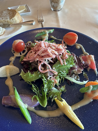 Read more晴れの休日に予約して訪れたい雰囲気の良いフレンチレストランです。 休日昼のコースを予約して、少し早めに到着。 フロアは手前と左奥に扉でセパレートされていて、手前が予約なしや葉山女子旅切符などクーポンのお客さまが楽しまれています。 左奥の部屋が予約席で到着順なのでしょうか、眺めの良いテーブルから順番に案内されます。 基本的にペアを想定してのテーブル配置と思われますので、少人数のお席が窓辺に、4名以上を想定してのお席は奥に配置されているようです。 窓からの眺めと会話を楽しみながらコース料理を頂くので、食事時間はどうしても長めになりますので、ランチでも遅めの時間予約になると、どうしても窓辺から遠くなるか、眺望をあきらめなければいけないことはあります。 また、周辺の道路は混むので窓辺を指定しての予約で到着遅延などあるといけませんので、眺め良いテーブルは到着順というのは頷けます。 幸いにも窓辺の席で、テーブルは可愛くセンス良くグラスと造花が配置されていて、柔らかな陽差しに妻と思わず満面の笑みがこぼれました。 さて、ランチですが、パンと数種から選べる前菜に本日のSOUP、メインは魚またはお肉のチョイス、食後のデザートの全5品とドリンクのコースにしました。 前菜は鎌倉野菜とベーコンのサラダを選択、アイスプラントの上に細かく刻まれたベーコンを乗せて、雪かまくらのようなカタチなのですが、このアイスプラントのかまくらを崩すと色とりどりの鎌倉野菜が宝石箱のように現れます。酢漬けや塩茹でなど少しずつ丁寧な下仕事がされていて味も見た目も楽しめました。 スーブは月替わりの野菜スーブで熱々の優しい味付けでした。メインは地魚か肉で肉は追加料金で葉山牛も選べますが、地魚を選び、これがまた鎌倉野菜を添えて見た目も愉しく、ソースもしっかりした味付けで美味しく頂きました。 デザートは枇杷とアイスクリームにしたのですが、出てきたときに「うわっ!素敵」と思わず写真を撮りました。 枇杷の甘さとスッキリしたバニラアイスが甘過ぎず程良い感じで、最後のコーヒーを頂くのに丁度良い組合せでした。 お店の方も丁寧にメニューの説明をしていただき、ま...