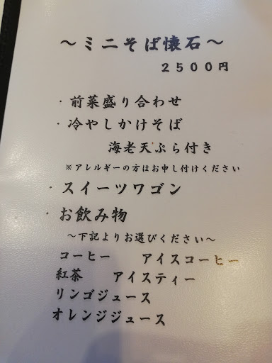 I was a bit hesitant but I am so delighted to have given it a try. The soba noodles are an original in-house specialty. Made on the spot makes them the best cold soba noodles I've had. The waitress is very kind and went out of her way to speak English. There is a set menu (some choices with pictures) which includes an appetizer, soba noodles with tempura (the broth is delicious) followed by dessert with either coffee or tea. The restaurant is a converted traditional structure overlooking a bit of a valley. I find it very quaint. Reservation required. Enough parking, but double up if going with friends....