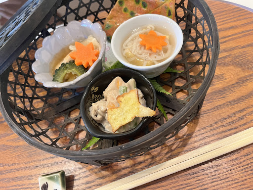 最初に出て来たのは籠に入った可愛い前菜3種。柿の白和え、鶏肉の甘酢漬け、卵豆腐などが入っていました。