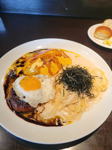 食事は目的のハンバーグとオムライスのセットプレートを注文。 ハンバーグはかなり柔らかめ。オムライスは卵がとろっと綺麗にドレスされてて良い感じ。 味は結構全体的にぼやっとした味付けで、ソースがすごい甘いです。好みはあると思うのでなんともですが、塩味かスパイスがもう少し立っていたらと思いました。