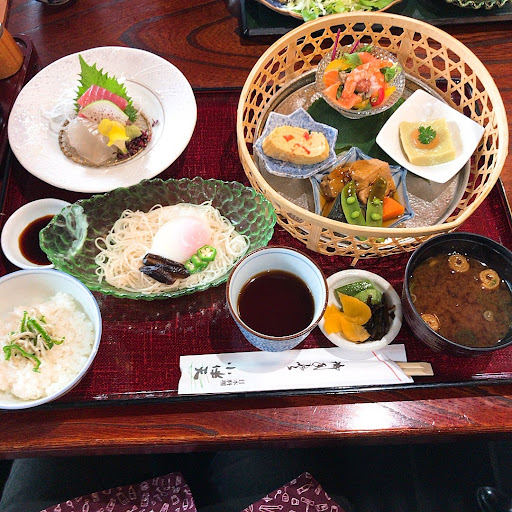 2019ミシュランガイドに掲載(ミシュランプレート)された創業大正9年の老舗日本料理店です。先代はかの伝説料理番組「料理の鉄人」で坂井シェフと対戦しています。日本料理で真空調理法を確立した店でもあります。 お店は駐車場もそこそこ広くて、店内も席数は充実しています。 本来でしたら一番のオススメである櫃まぶしを頂きたいところですが、季節限定のランチが食べたくなりまして、今回は「夏の花膳...