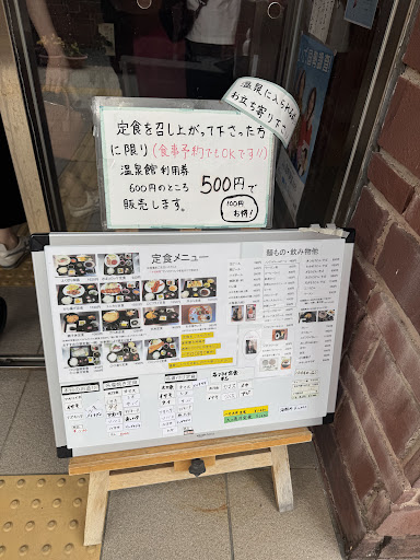 Read moreホワイトボードから本日の定食メニューをお造り、煮付け、焼き魚の中から選べます。わたしはハマチのお造り定食を注文しましたが新鮮で美味しかったです。見た目少なさそうに思えましたがごはんをおかわり(1回は無料)しました。プリプリで食べ応えありました。ミドルにはちょうどよかったです(笑) 入浴料が600円なので食事しても2000円以内に...