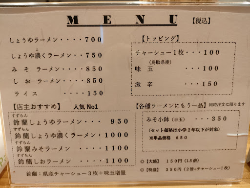 Read more2025 8/31 14時前着。少し待ちました。 「鈴蘭しょうゆ濃くラーメンネオ」、「鈴蘭しおラーメン」、「ライス」を注文。 しょうゆラーメンは濃い印象ですが香味油のこめ油が効いていて久々に醤油で美味い!と感じました。 塩ラーメンも塩と香味油が効いていて美味しく、これも久々に美味しく感じました。 後、とにかくチャーシューが絶品。厚さ、柔らかさ、味ともに絶妙です。 いろんな店でチャーシュー丼とかありますが比じゃ無いです。 最近はレアチャーシューなどに慣れていて、後、年齢もありますが厚切りの濃いのはダメな感じですがここのは何枚でも食べてみたいくらいハマりました。