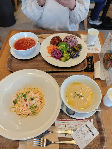 Read more初めて行ってみたのですが、注文も席を確保してから券売機で注文するパターンでした。 が、券売機の前で3組くらいの人が、席が空いてるのに予約席の札が置いてあるままで、席を確保出来ず困っていました。が、店員さんも少ないのか作ることで忙しいのか対応もなくずっと待っている状態。キッチンの人に訪ねてやっと席が取れました。予約札を置いたまま帰る人がいたからです。せめて、忙しいランチタイムには、1人でも案内する従業員がいた方良いのではないかと思いました。 私もプレートの料理を注文したら健康食だったのだと思いますが、ほとんど売り切れだったのもあり、私は明太子クリームソースのパスタとスープ注文しました。麺は太く茹で加減も柔らかすぎ4本の麺がくっついて離れてないようなのが何個かあり、野菜もかいわれ大根が数本のみ、全く健康な食事では無かったと思いました。これで、1300円??って感じで。スープを注文していて良かったです...