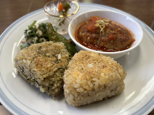 Read more木曜日のハーブとスパイス料理を食べに行ってきました。 スパイス焼きおにぎりのランチプレートをいただきました。 焼きおにぎり2種・トマトソースハンバーグ・春菊サラダ・ピクルス・スナップエンドウのナムルが、ワンプレートに盛り付けられており、大満足でした。 どの料理もスパイスとハーブが程よく効いていて、味を楽しんでいるうちにあっという間に完食しました。 焼きおにぎりは、異なる2種類の味付けで、丁寧に説明もしてくださいました。 出汁をかけてお茶漬けにできるのですが、美味しすぎて、お茶漬け用に残すのに苦労しました笑 デザートのあじさいパンナコッタは、味も美味しかったですが、なんといっても色が美しかったです。美味しいコーヒーと一緒にいただきました。