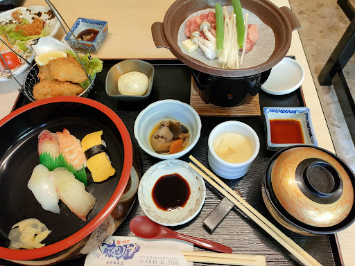 それぞれ牡蠣・ステーキ御膳2300円・海の味御膳3200円・煮付け御膳2400円を選んで戴きました。 海の味御膳には握り寿司・お刺身・天麩羅・牛ステーキ陶板焼き・茶碗蒸し・小鉢・お味噌汁・デザートが付いて盛り沢山です。 牡蠣も今が旬で身が大きく美味しそうでした。