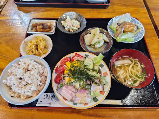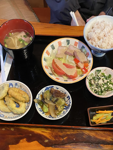 Read more【のぶたと南の島生活inやんばるを食べ尽くせ❗26】 この日は東村の挨拶回り。 東村は人口が少なくて、飲食店も限られでいます。 唯一、BMしているお店は有銘にある『森のふくろう』さん。当然、ランチタイムは『森のふくろう』へ向かいました。 幹線道路を走っていると、小川に沿って山奥に向う村道にデカい看板が立っています。 それには『森のふくろう』さんは夜営業のみの営業時間が掲載されていました。 ランチはやってないのかなぁ~と不安になりましたが、一応、お店までダメ元で行ってみましょう。他に行く宛もありませんからね(笑) お店は、小川に並走する村道の行き止まりにありました。とても自然豊かな場所です。 駐車場の営業中の看板も裏返し(^_^;) これはランチタイムやってないのかも・・・駐車場から歩いて母屋とお食事処に分かれている建物に向かいます。 小川の橋を渡ってお食事処にたどり着き、店内を覗くとお店の方が居ました。 確認すると営業しているとのこと。 店内に入ると、宴会場もあるかなりキャパのあるお店です。 窓側にはふくろうのオブジェが沢山ありますね。 ランチは、 ふくろう定食 1,200円 ふくろうそば 700円 の2種類のみ。この日は、ふくろうそばは無くて定食のみとのこと。 ふくろう定食は、自家栽培や地域野菜を使っているとのことで、季節により内容が変わるそうです。 それが写真のふくろう定食。 メインは豚肉の燻製なんだそうで、確かに風味が良くて美味しい燻製ですね~ 副菜が豊富なヘルシーな定食で、単身赴任で野菜不足なnobutaには、とても有り難い定食でしたよ。 お店は、オープンして20年が経つそうで、親子で経営されているようで、お隣の母屋は一棟貸のペンションなんだそうです。 4月から6月に掛けて蛍が楽しめると話されていました。 美味しかった...