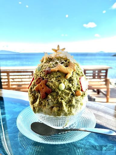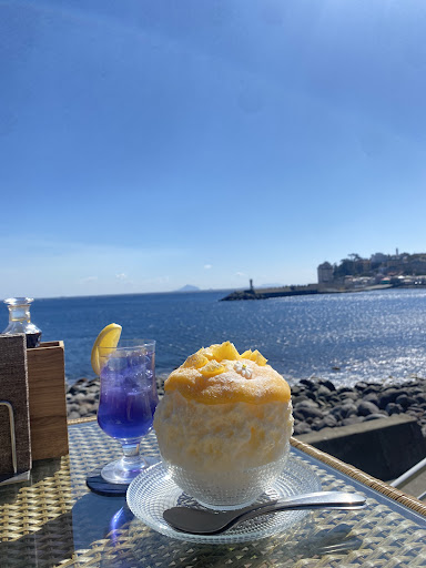 海が目の前の絶好のロケーションです。 稲取の街並みと、天気が良ければ伊豆大島や利島が眺望出来ます。 7月から9月まではかき氷のみの提供になっています。