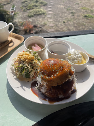 Read more国道135号線を伊東市から東伊豆町へ向かい、稲取漁港への入口より手前に小さな看板が出ていて気になっていたお店です。 日曜休みらしく、なかなか行けるタイミングがなかったですが、平日休みが取れたので行ってみました。 伊東市を背に、小さな看板がある小道を左折すると左側にお店が出て来ます。 眼下に稲取漁港と大海原が広がる眺望は素晴らしいです。 空いていたので店内とテラス席を選ぶ事が出来たので、テラス席にしました。 海に向かってカウンター席に思えた席は、なんと4人掛け席だそうで、2人で行った我々はNG。 テーブル席に座りました。 今回はランチではなく、食後のデザートを食べるために訪れたので、夫はミニチョコレートパフェを、私は昔ながらの沖縄ぜんざいを注文。 昔ながらの沖縄ぜんざいは金時豆が上に乗っていて、中にも金時豆や白玉や麦が入っているので、よーく混ぜて食べるそうです。 黒蜜と生姜の味がして美味しいです❣️ きな粉も掛けるように言われたので、途中で掛けて味変させてみました。 少し山梨の信玄餅っぽい味になりました。 テラスの下には階段で降りられるようになっていて、海に向かって漕ぎ出すブランコがあったりします。 お店の方に言えば乗らせて貰えるのかな? まあ、中高年は乗らない方がいいかな? 店員さん、ちょっと威圧感あって怖いけど、次は食事をしに行きたいと思います。