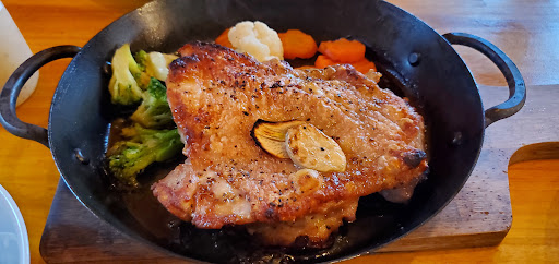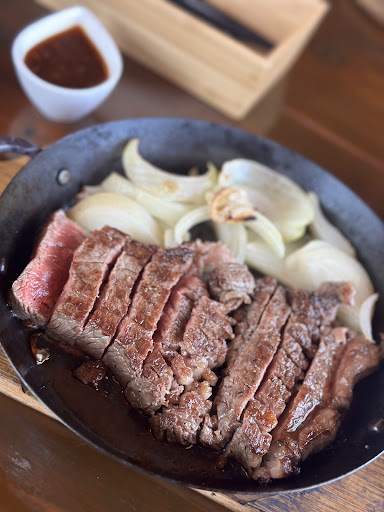 焼き加減はレアでジューシーです赤身らしく噛みごたえがあります肉好きにオススメです、甘めのステーキソースと添えてある玉ねぎを一緒に食べると旨味が増します😄