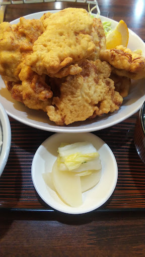 クチコミ通り、唐揚げはムネ肉の鶏天でした。下味が薄いのか浸かってないのか?あまり味がしませんでした。個人的にはチキンカツの方がサクサクで断然美味しかったです! 早々に唐揚げは持ち帰って味変して食べる事にして、二人でチキンカツをメインに食べました。ご飯の量も多かったです。ご飯は持ち帰れないので、私はご飯でお腹いっぱい笑。