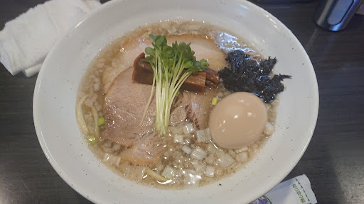 Read more埼玉県に用事がありインターネットでヒットした当店。 ピーク終わりと思われる13時半頃到着しましたが、待ちは無いもののほぼ満席。 初めてだったのと、若干の二日酔いだったため汁を欲してたので味玉入り塩煮干しラーメンと別皿の辛味とやらを発注。 周りはつけ麺を召し上がられてる方が多かった印象です。 5〜6分ほどで提供され、まずキレイな盛り付けにテンションが上がりました。 スープはやや背脂が浮き私の大好物である燕三条系ラーメンを彷彿させるビジュアル。 一口飲むと、繊細でもある塩味と、あとからパンチのあるコクが感じられました。 麺はというと、細麺を想像していましたがなかなかな太麺であり、とてもインパクトがありました。 やや固めに茹でられた太麺は非常にコシがあり、しっかりとスープにマッチしております。 玉ねぎやカイワレが入っていることにより、若干こってりなスープを飽きさせず、箸休めになるので最後まで飽きずに完食できました。 麺量は結構あるので、大食いや学生、土方の方でなければ並盛で十分すぎるかと思います。 価格は埼玉にしては少し強気でほぼ都内と同じくらいの設定。しかしクオリティは紛うことなく価格に見合っておりました。 14時頃退店すると、あらビックリ。店外のウェイティングスペースが埋まっておりました。 他にも気になるメニューが多いので、また埼玉方面に来た際には再訪したいと思います。 合掌。