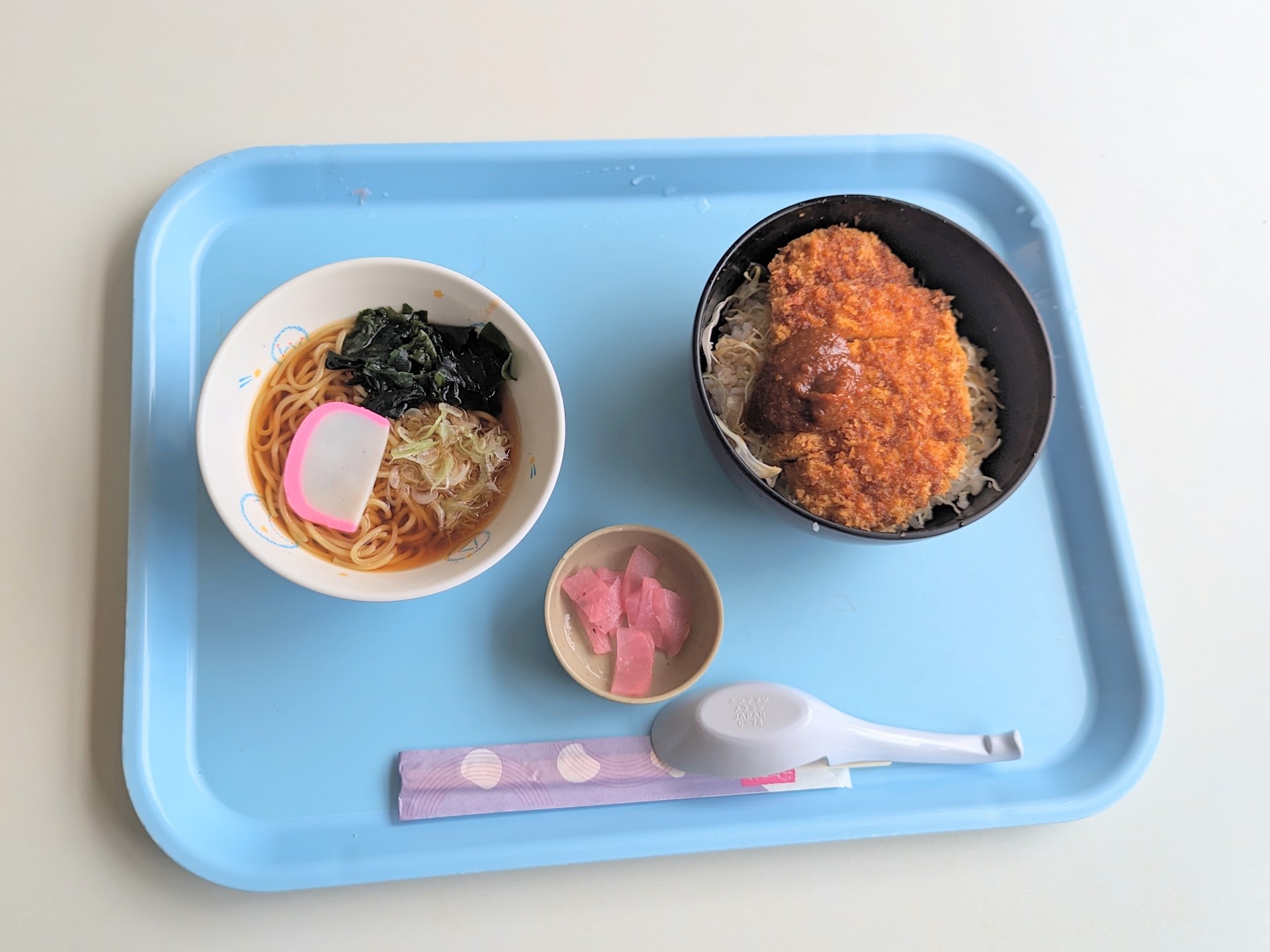 渡されたカツ丼もハーフラーメン、その配膳トレー、食器は小学生時代の給食をほのかに思い出すスタイル。