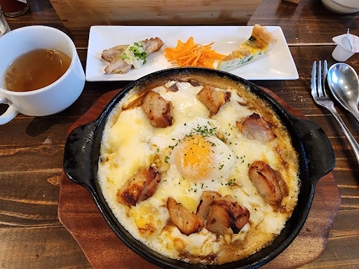 We ordered 2 orders of hamburg omurice, 1 hamburg doria and 1 chicken egg curry doria (my own dish which was just a little salty). Overall, the food tasted great. We got free appetizers and soup as well. Soup and water is self-service as the establishment is run by the family living in the house attached to the restaurant, so they do not have a lot of staff.