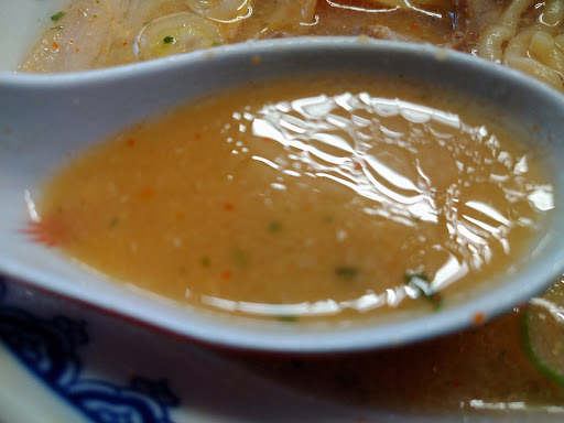特徴的なのは厨房内中央部の島になった盛付台。 スープ投入、麺投入、盛付、仕上げ3方から4人がかりで仕上げる作品はお見事。 麺の湯切り時は軽快なステップで、リズム良く器へ移すさまはまるで舞っているかの如く躍動感がある。 提供された「からみそラーメン」はシンプルな素材の組み合わせがマッチしていて、「赤玉」なるにんにくのパンチの効いた刺激が特徴。 スープに溶く前と溶くあとでの味の違いをぜひ体感してほしい。 今回は一人旅であったが、25年前、ラーメンは豚骨しか知らない福岡出身の妻が、こちらのラーメンを食べれるようになったのは味噌ラーメンが切り口。 おそらくその妻も納得するであろうこの「赤湯からみそラーメン」、...