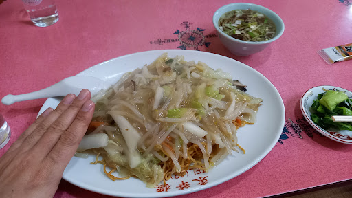 あんかけ焼きそばはかなり薄味。海鮮は入っておらず、野菜多めのタンメンみたいな味でした。肉やら魚介の旨味が欲しかった。麺も油で焼かれたようなパリパリ感はなく、汁っ気を吸った感じ。
