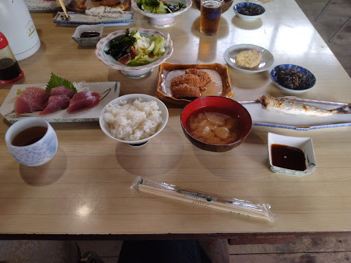 Read more梨狩りの後に少し遅めのランチとしてパートナーと2名で利用しました。三連休初日の13:30頃訪問したので混んでると思いましたが大丈夫でした。お店は、魚屋さんの片手間に食事提供されてる感じです。室内はログハウス調で、大きなテーブルが3つ有り20名位は座れそうです。お茶や醤油皿、グラス、湯呑みはテーブル上にありセルフサービスです。メニューは刺し身定食(1000円)のみで入店時に人数申告して注文完了です。着席してすぐに配膳されますが定食の1品ずつ順番に出てきました。ご飯、味噌汁、ひじき煮、サツマイモ天ぷら、カツオのカルパッチョ風サラダ、鱧煮付け、カマス塩焼き、マグロ造りの8品でどれも美味しかったです。海から遠く離れた滋賀県湖東地区で安くて美味しい魚料理が食べられて、魚好きとしては大変良かったです。魚より肉が好きなパートナーも凄く美味しくと完食してました。ごちそうさまでした。会計後にクーラ持参していなかったので魚少し見せてもらうだけでしたが、当日は大きなヒラメ、タイ、ハマチ、キハダマグロ、マルソーダ、イトヨリがトロ箱にありました。鮮度は良さそうで皆さん買って帰ってました。頼めば希望に応じて下処理しますとの事です。最後にかなり品数多く出てくるので少食女性は大変かも知れませんが持ち帰り容器あるので心配なしです。お魚好きさ...