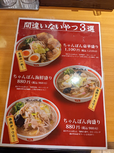 Read more近江ちゃんぽんの店。ローカルフードに挑戦。 (アクセス) 彦根ICあたりからあちらこちらにあるチェーン店。ここはR8沿いにあった。 (料理) 近江ちゃんぽんの他にも味噌ラーメンとか餃子とかいろいろある。 (料金) 近江ちゃんぽん、麺大盛り、ライスは大中小選べる150円。これで1000円超え。セットメニューがないのと食券でマイナス。 初めて食べるであれば席でタブレットなどがいいかな? (味) 麺は細め。スープは複雑な味だがおっさりて飲める。普通に美味しい。和風味。 (サービス) 最初に食券を購入。男性に渡す。半券も残らない。領収書はいえばもらえる?お土産て餃子を頼んだが食券を購入するが、並んていたので先に厨房に仮オーダー。気持ちよくコンビ...
