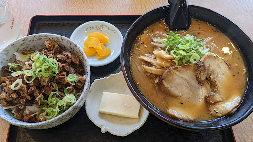 Read more味噌ラーメンにバタートッピング😋ミニチャーシュー丼と餃子いただきました! ラーメンは中太縮れ麺であっさり味噌スープに良く合います! チャーシューとネギ、メンマと王道の付け合せにトッピングのバターを入れたらコクのある甘いバターの香りが最高です!味変を楽しむならバター無しで1/3、半分入れ1/3食し、ラスト前入れが正解です😋 入れるたびにコクとカロリーが心とお腹を満たします。 ミニチャーシュー丼と名の大盛りチャーシュー丼はしっかりと煮込まれたチャーシューの下にキャベツの千切りが敷かれています。キャベツとネギのおかげでボリュームがあってもあっさりしていてサクサクいただけました😋 餃子は定番の餃子のタレではなく、味噌ベース?のつけダレでいただくのですがこれもまた逸品✨たっぷりタレをつけてメシを書き込み味噌バタースープを飲む。最高でした! とても美味しかったです...
