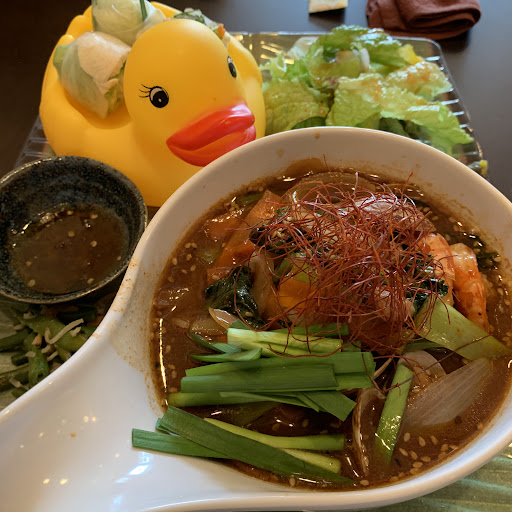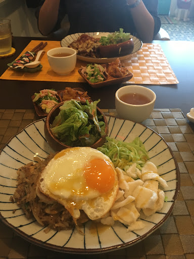 外観もこじんまりして可愛らしいですが、 店内もアジアンな雰囲気たっぷりでオシャレで可愛いです。居るだけでテンション上がる^^ 韓国 辛い海鮮チャンポンランチと相がけカレーを注文 海鮮チャンポンは前菜2種類と春巻き、チャンポンが付いてます。春巻きは生春巻きか揚げ春巻きか選べます。 ワンプレートで来ますが、プレートにアヒルが^^ 目でも楽しましてくれます。 味もコチュジャンと海鮮スープがあいまってとても美味しかったです。 この日の相がけカレーは鳥ミンチと玉ねぎのグリーンカレー&和風スジカレーでした。 グリーンカレーは癖は無く食べやすいグリーンカレーでした。スジカレーもトロけるスジが美味しかったです。 ランチだけかな?300円追加でドリンクセットを追加しましたが、ドリンクがとんでもないくらいの種類があって選ぶのにかなり悩みます! ミルク、ソーダ、アイスティー、、、どれもその中で10種類くらいの変わり種ドリンクがあります。 単品でしたら、480円位ですが、ドリンクセットなら300円で好きなドリンクとデザートが付いてるのでお得です。 デザートのもちもちプリンはほんのり温かくてモチモチで美味しかったです。 トイレもアジアンチックで手洗いは貝殻から水が流れ出てきます。端か...