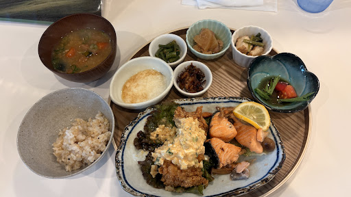 レンコンと枝豆 ⭐️2 コーンほうれん草 ⭐️2 ナスしめじにんじんさつまいも紫キャベツ揚げ大豆の味噌汁 ⭐️4 具だくさんで美味しい 輪切りピーマンと椎茸の肉詰めレタス一枚 ⭐️2 2色大豆レタスミニトマト ⭐️2 もずく ⭐️1 高菜っぽい漬物 ⭐️1 ヨーグルト ⭐️1 通常提供される水が水素水 食後にヨーグルトと一緒に出してくれるHOT烏龍茶 ⭐️3 税込¥1,800 4人席3(2人席6) カウンター4 個室座卓6〜8人席 駐車場無し オーガニック料理ソムリエ 表彰されてる方4名(難易度⭐️2) 自宅でオーガニック料理を作るのは面倒くさいので、健康を目的とした食事を考えるなら良いと思います♪ 美味しさを求めて外食するなら微妙。