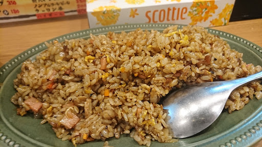 炒飯は鍋振ってる音がしたのが不思議なくらいベチャベチャで、砂糖とみりんで味付けしたよな味。炒飯ではないです。 見た目黒くて香ばしそうなんだけどそんなこと無いので注意。 ※炒飯に砂糖も美味しいですよ。お試しあれ(自分家で)。