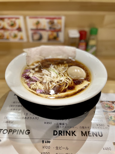 中華そば+味玉900円@彩りsoba九兵衛 瓢箪山駅前店in 大阪府東大阪市神田町 【記号は食べ物ではない】 こちらの店舗、荒本にある「中華そば九兵衛」のフランチャイズ店だそうで、丁度伺った日が開店初日。 店頭には祝い花、店内にはヘリウムガスの風船が飾られ、新規開店を彩っていた。
