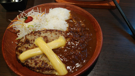 本日のメインは、チーズカレーバーグディッシュ300g・ごはん大。 すぐにバーグには手を出しません。 バーグを半分割ってチーズの上に乗せて、チーズをとろけさせながら特製マヨネーズの大根サラダから。はい美味しい。 そして満を持して!バーグ!! とろけたチーズと、これまた特製、醤油ベースっぽいタレ、さらに、ちゃんと大人が旨いと思えるほどよい辛さのカレーソースが渾然一体となって…… う…う…旨すぎるんじゃ~~(^^)