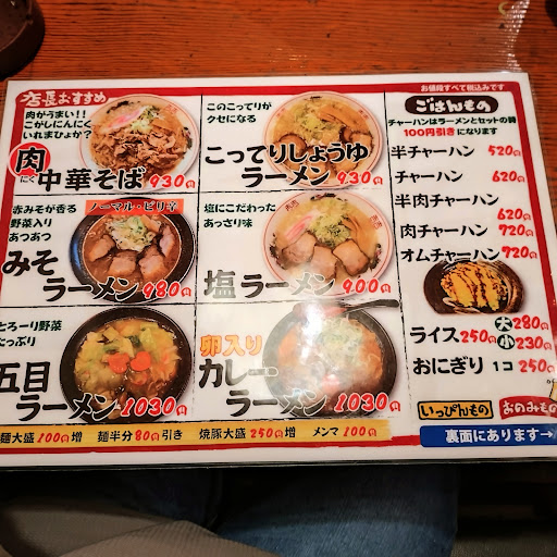 先日お昼ごはんで寄らせていただきました!😊 お店のとなりと奥に🅿️があります。これは助かります。🙆 お店に入ってメニューを確認。こってりしょうゆラーメンと半チャーハンをお願いしました!😋 店員さんにキムチバーがあるのでどうぞと教えてもらい早速取りに行くとキムチの他にネギやポテサラや半割りのゆで卵や生ニンニクやその他いっぱいありました!😲 なのでキムチとポテサラと生ニンニクとネギとゆで卵をいただきました。😁 ほどなくしてラーメンと半チャーハンが着丼。それと焦がしニンニクも持ってきてくれました。😄 まずはスープを一口。。( ゚Д゚)ウマー 背脂たっぷりの豚骨スープはめちゃこってりです!そして麺をズズッ。( ゚Д゚)ウマー 喉ごしのいい美味しい麺です!からのチャーシューをパクり。。( ゚Д゚)ウマー( ゚Д゚)ウマー めちゃくちゃとろとろでええ味付けの美味しいチャーシューです!😋 そして半チャーハンをパクり。。 ( ゚Д゚)ウマー( ゚Д゚)ウマー(...